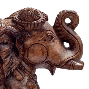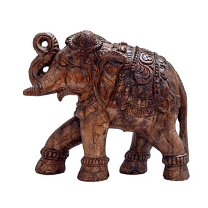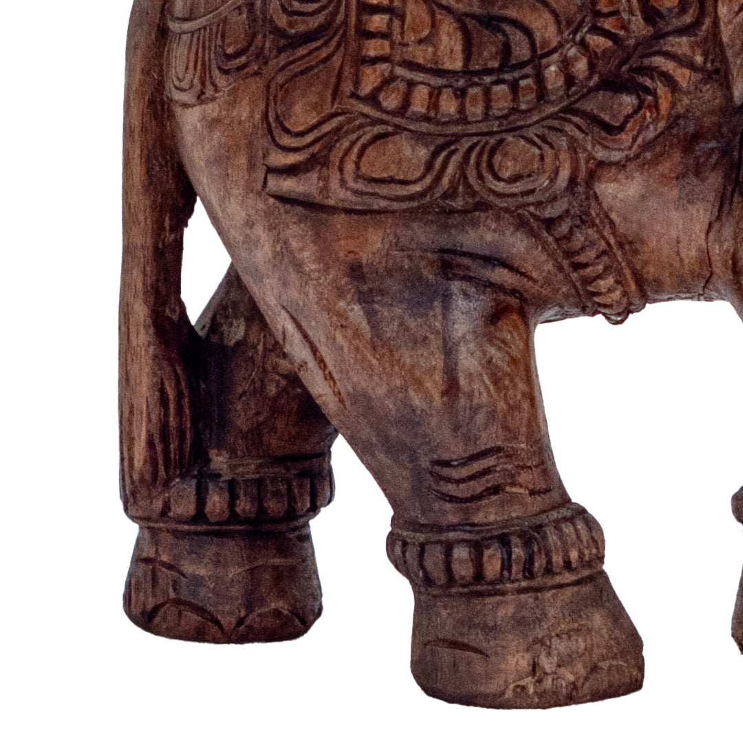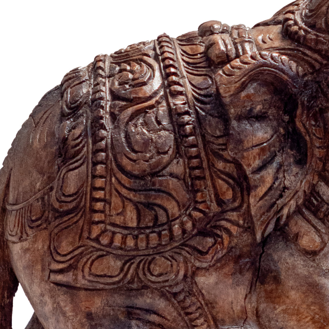 A beautifully carved wooden elephant featuring intricate detailing that celebrates traditional craftsmanship. Symbolising wisdom, strength, and good fortune, its graceful form brings cultural richness and quiet elegance to any space.